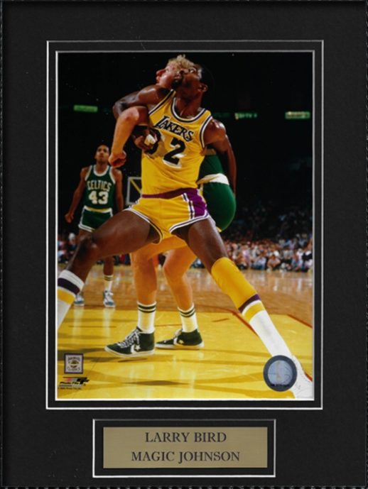 Larry Bird and Magic Johnson 8×10 photo matted to 11×14, arms locked.