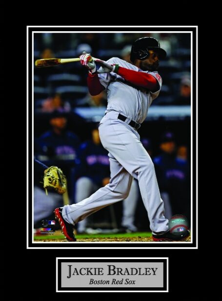 Jackie Bradley Jr Photo Swing matted to 11×14. This item is not framed unless you select the option for the cherry or black frame.
