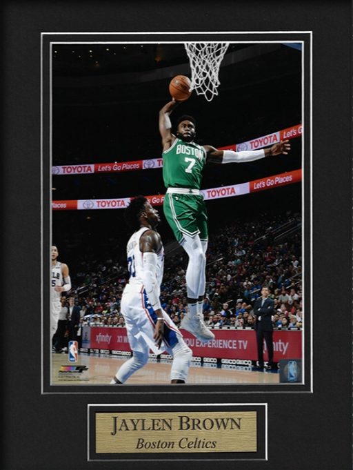 Jaylen Brown 8×10 photo matted to 11×14, in air to dunk.