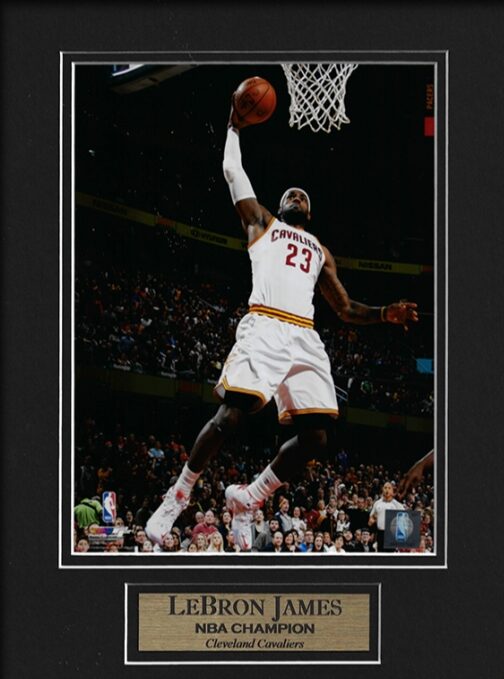 LeBron James Photo in air 11×14. LeBron is about to dunk when he played for the Cleveland Cavaliers.