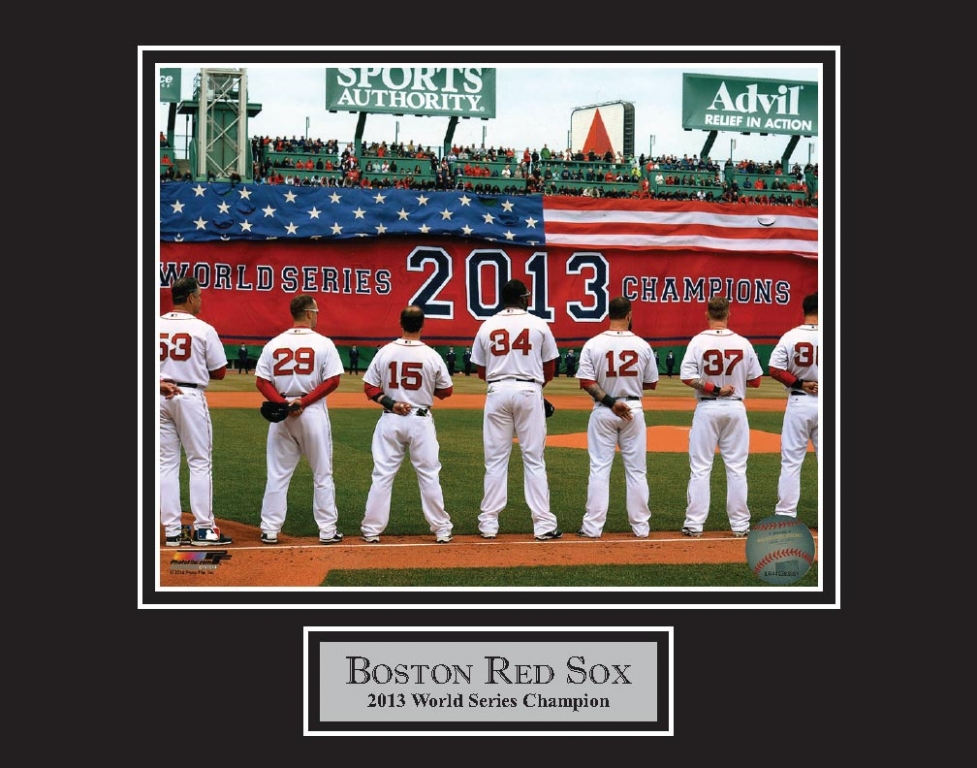 Boston Red Sox 8×10 photo matted to 11×14 in front of the World Series Banner 2013.