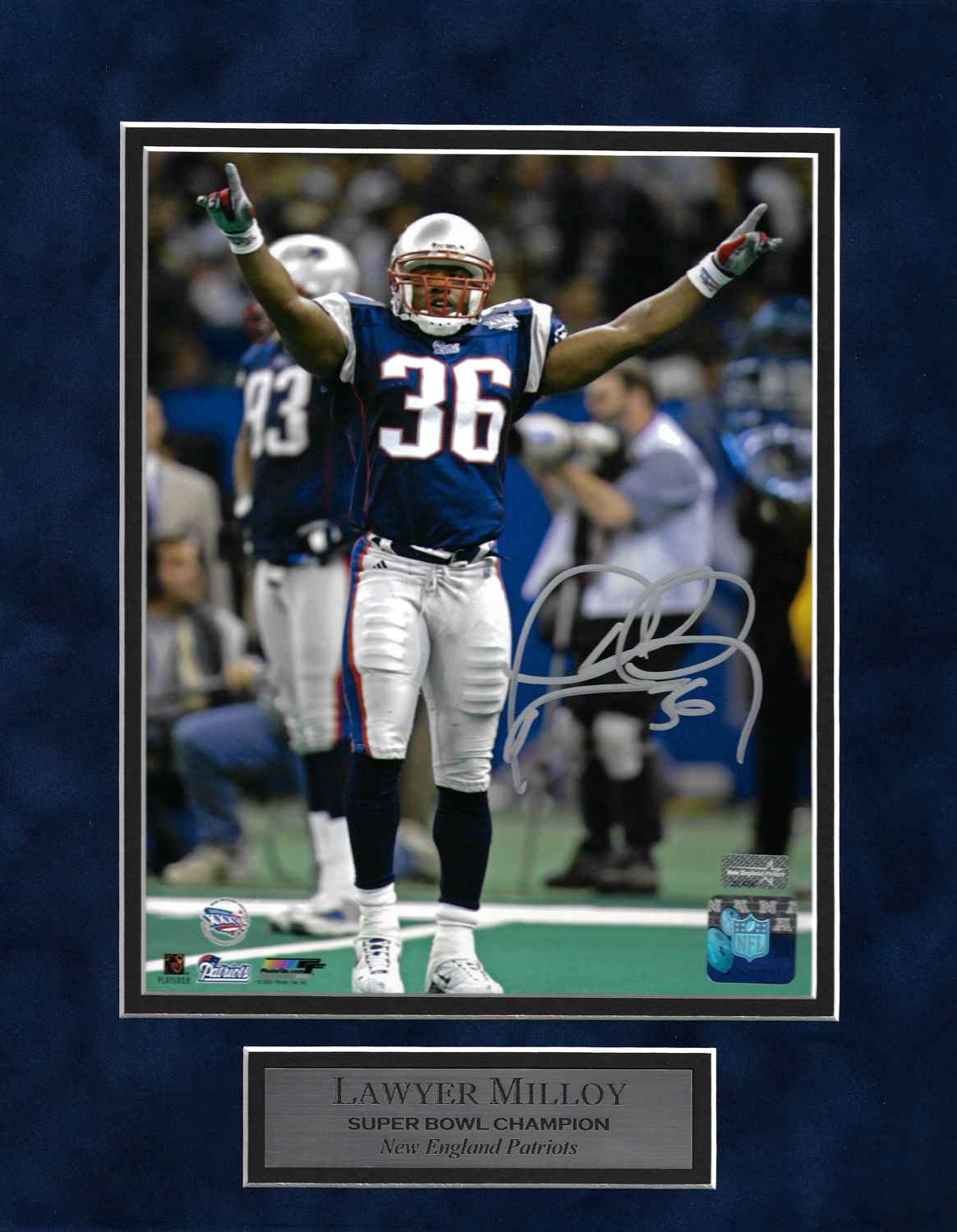 Lawyer Milloy Autograph Photo Super Bowl XXXVI Arms Up 11×14