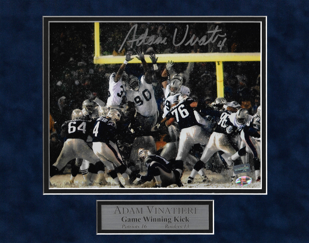 Adam Vinatieri Autograph Photo AFC Playoff game Snow Kick matted to 11×14.This item is not framed unless you select the option for the cherry or black frame. Adam Vinatieri kicks the game winner in Foxboro. Adam Vinatieri kicked two field goals in the snow covered field while it was snowing. The first field goal was a 45 yard kick to tie the game. Belichick said, “I would say it was by far the greatest kick I have ever seen. The conditions were very difficult. There were probably three to four inches of snow on the ground.” Fans at the game could barely see the football got thru the uprights thru the heavy snow. The New England Patriots win and go on to win their first Super Bowl in 2002. Super Bowl XXXVI, in New Orleans, was a shocker with Adam Vinatieri kicking a game winning field goal as well.