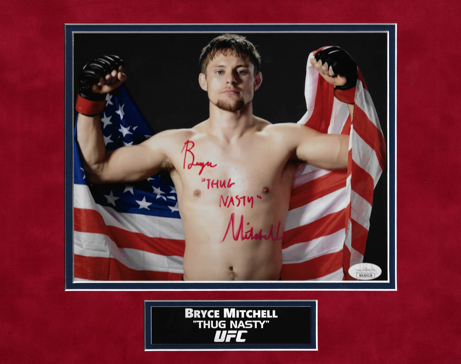 Bryce Mitchell autograph photo holding flag with “Thug Nasty” inscription matted to 11×14, UFC.