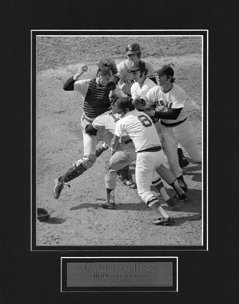 Carlton Fisk photo fight Thurman Munson matted to 11×14, Boston Red Sox. This item is not framed unless you select the option for the cherry or black frame. Thurman Munson collided with Carlton Fisk(Boston Red Sox catcher) in 1973, sparking both dugouts to empty in the 9th inning fight. The Boston Red Sox won the game 3-2.