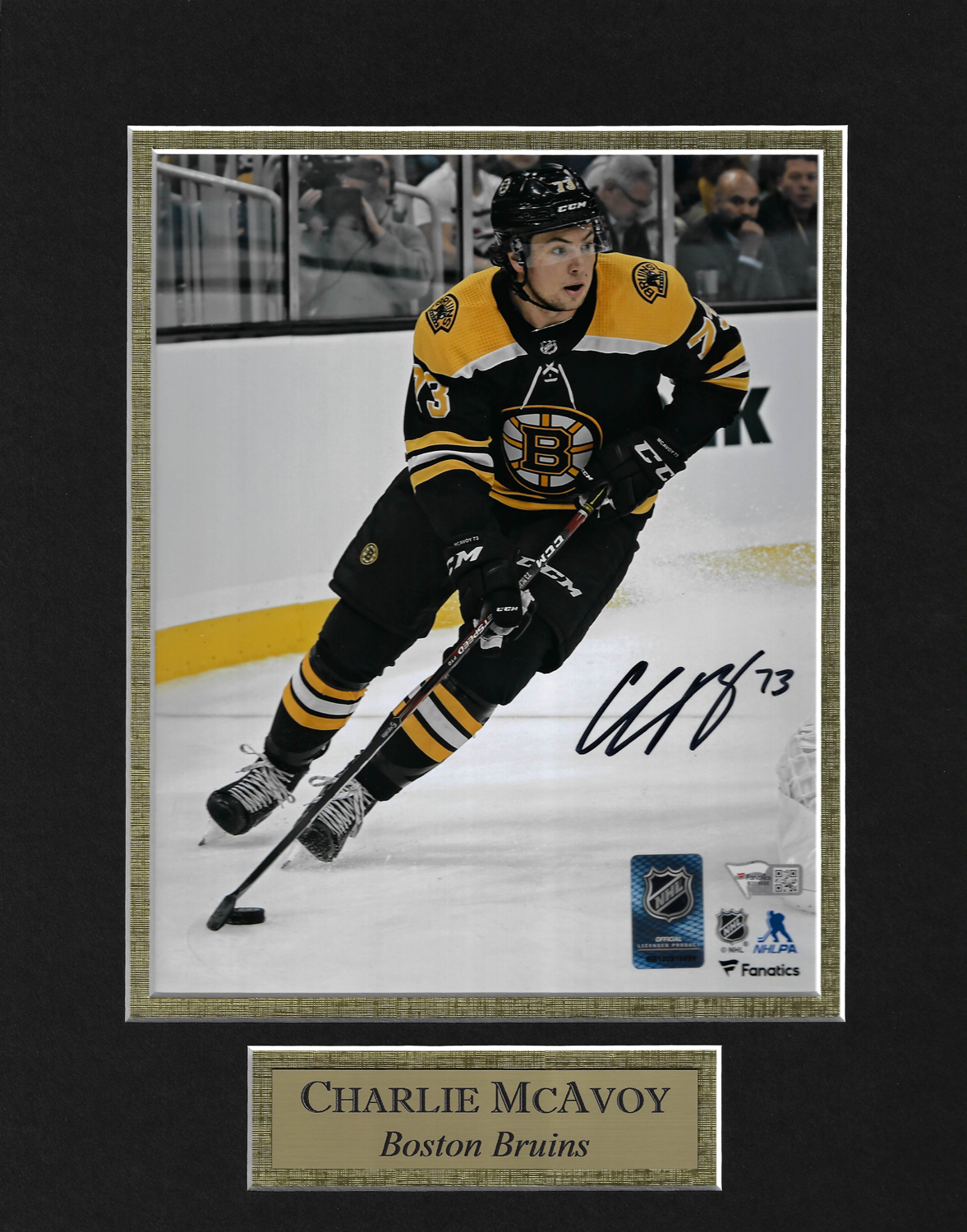 Charlie McAvoy Autograph Photo Black Uniform Skate Alone 11×14