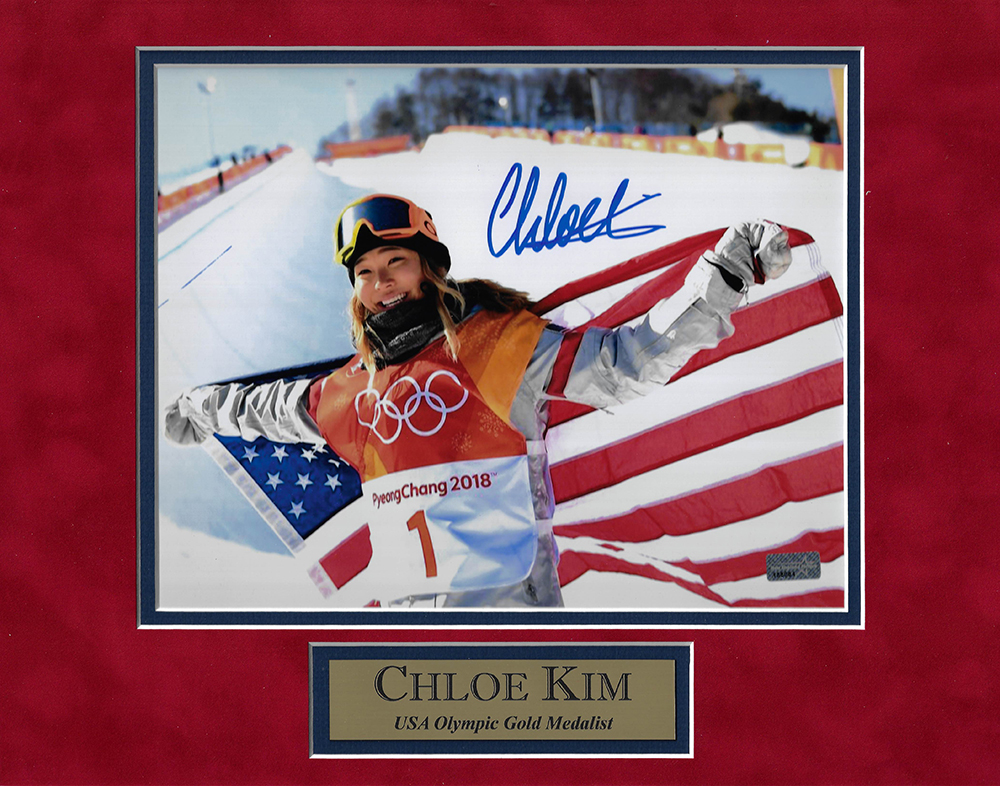Chloe Kim autograph photo celebrate 2018 Olympics matted to 11×14. USA Olympic Champion. This item is not framed unless you select the option for the cherry or black frame.