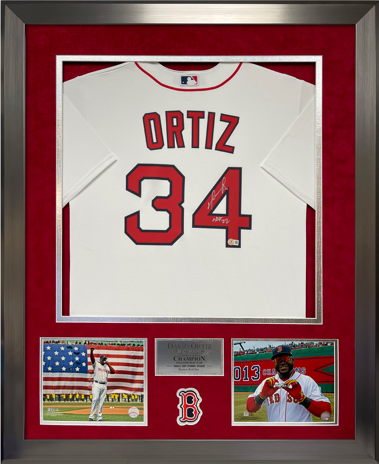 David Ortiz autograph jersey white with inscription “HOF 22”, matted and framed to 32×40, Boston Red Sox.