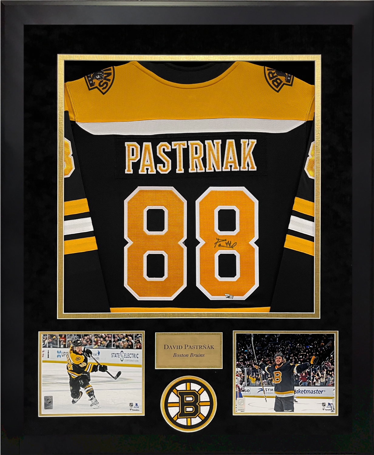 David Pastrnak autograph jersey, matted and framed to 32×40. Boston Bruins.