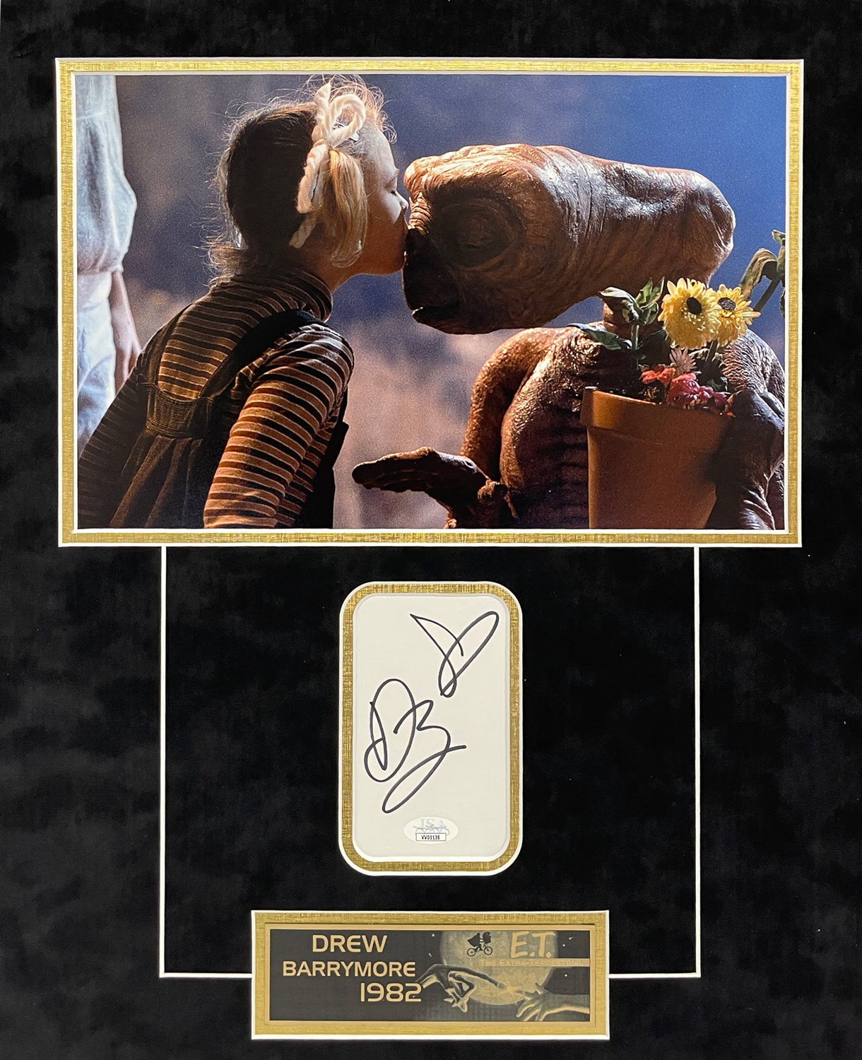 Drew Barrymore autograph cut signature ET collage matted and framed to 17×21.5. Barrymore played Gertie in the film E.T. The Extra-Terrestrial.
