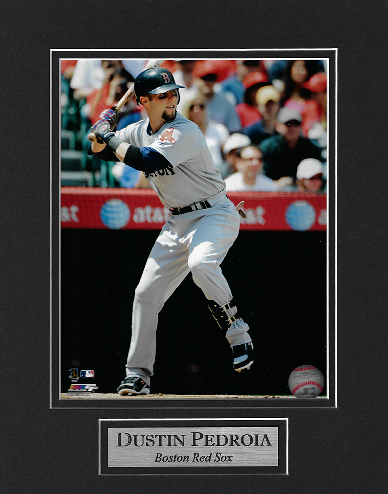 Dustin Pedroia photo at the plate matted to 11×14, Boston Red Sox. Dustin Pedroia was the AL Rookie of the year in 2007 and won the World Series in 2007 and in 2013 with the Boston Red Sox. Dustin Pedroia was the AL MP in 2008 as well as a 4 time All-Star and 4 Time Gold Glove award winner.This item is not framed unless you select the option for the cherry or black frame.
