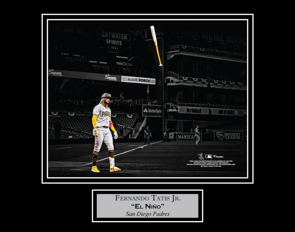 Fernando Tatis Jr bat flip spotlight matted to 11×14, San Diego Padres.