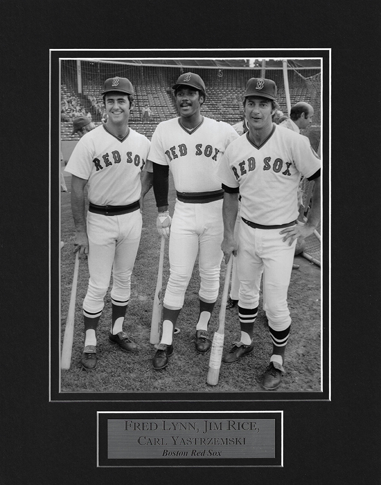 Fred Lynn Jim Rice Carl Yastrzemski photo pose matted to 11×14, Boston Red Sox.