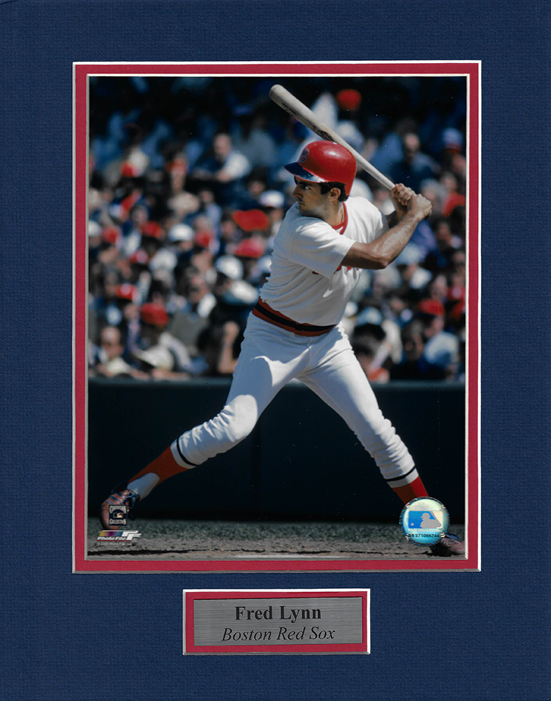 Fred Lynn photo ready matted to 11×14, Boston Red Sox. Fred Lynn won AL MVP in 1975 and AL Rookie of the Year in 1975. He was a 9 time MLB All-Star too and a member of the Boston Red Sox Hall of Fame. This item is not framed unless you select the option for the cherry or black frame.
