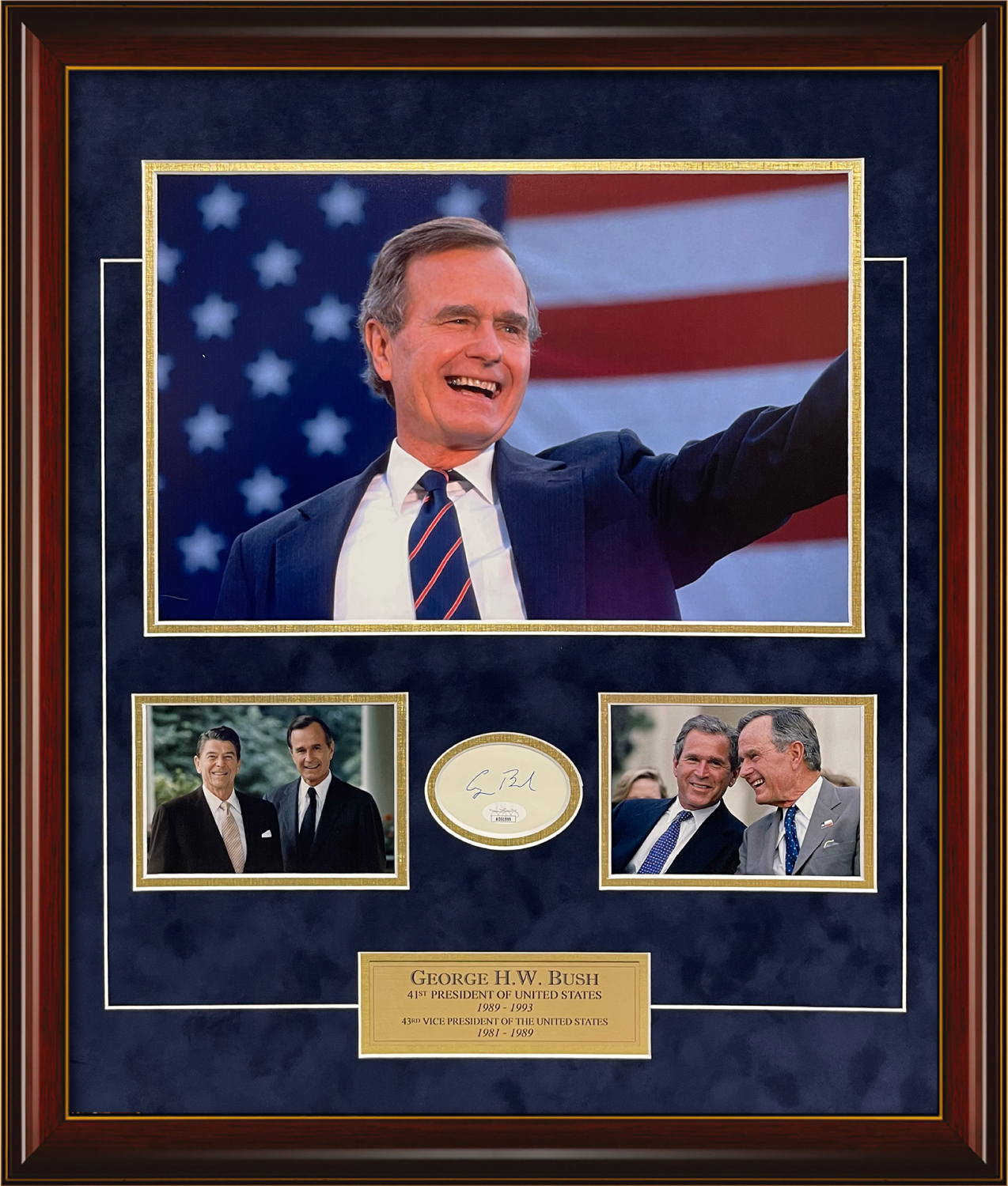 George H.W. Bush autograph president photo collage cut signature, matted and framed to 20×24, 41st President of the United States of America.