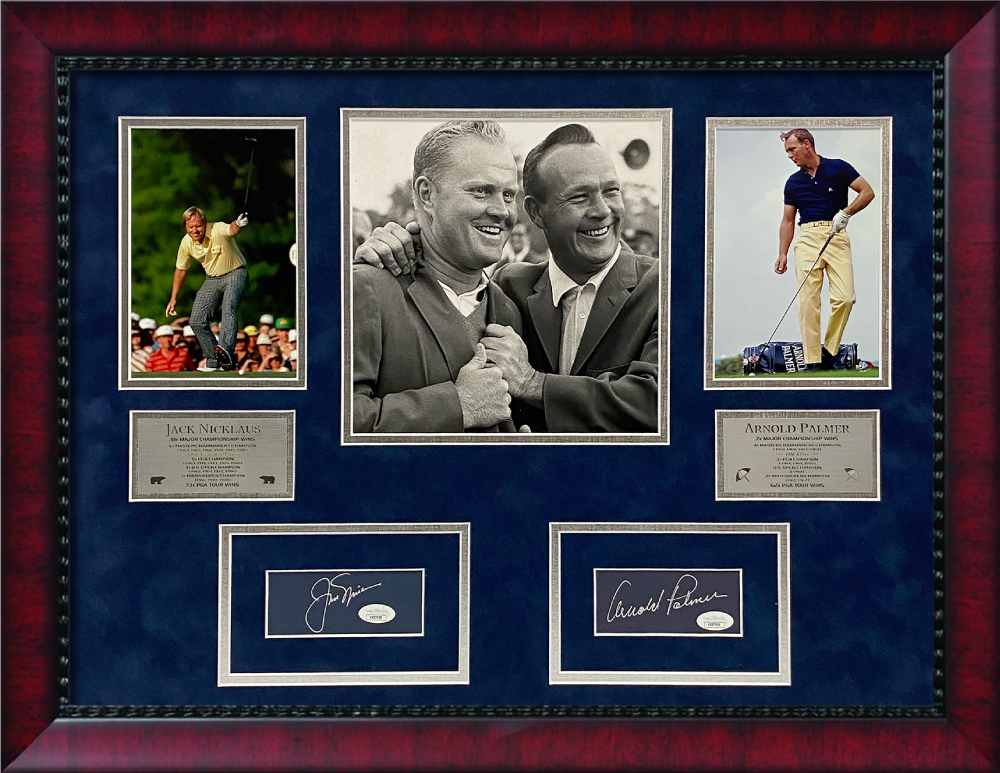 Jack Nicklaus Autograph and Arnold Palmer Autograph Cut Signatures with 3 photos framed to 18×24. The photos include Jack Nicklaus classic shot at the ’86 Masters winning at the age of 46, a black and white photo of Jack and Arnie smiling together and lastly a nice photo of Arnold Palmer in color. The cut signatures are JSA authenticated and the matting and framing make it a signature piece of golf memorabilia.