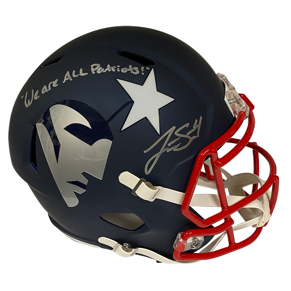 Jarrett Stidham autograph helmet inscription replica AMP, New England Patriots.