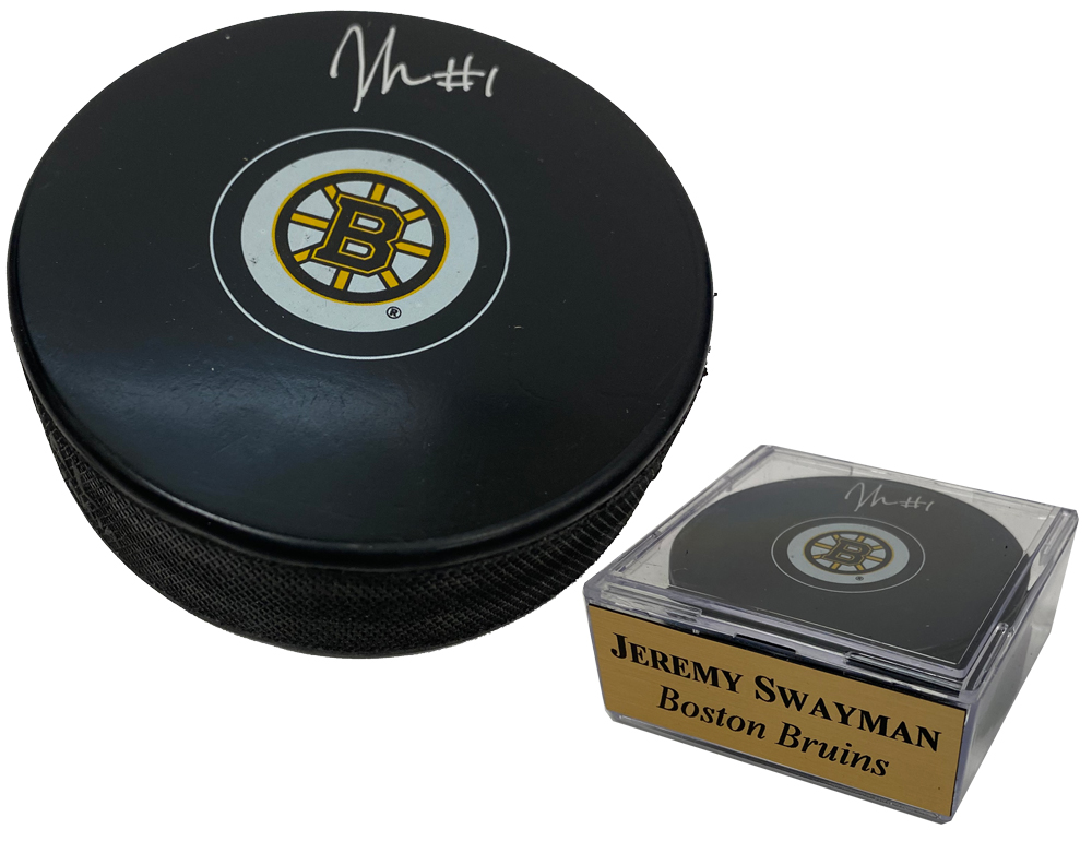 Jeremy Swayman autograph puck Bruins B, Boston Bruins. This puck comes in an acrylic case complete with a plate depicting the player’s name and team.