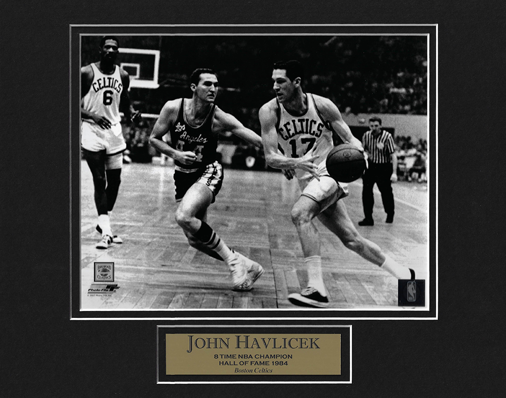 John Havlicek photo dribble matted to 11×14. This item is not framed unless you select the option for the cherry or the black frame.