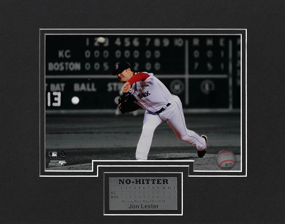 Jon Lester photo pitch 2008 no hitter matted to 11×14, Boston Red Sox. This item is not framed unless you select the option for the cherry or black frame.
