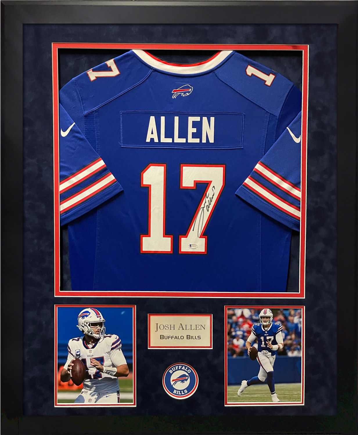 Josh Allen Autograph Jersey Nike Blue matted and framed to 32×40, Buffalo Bills quarterback.