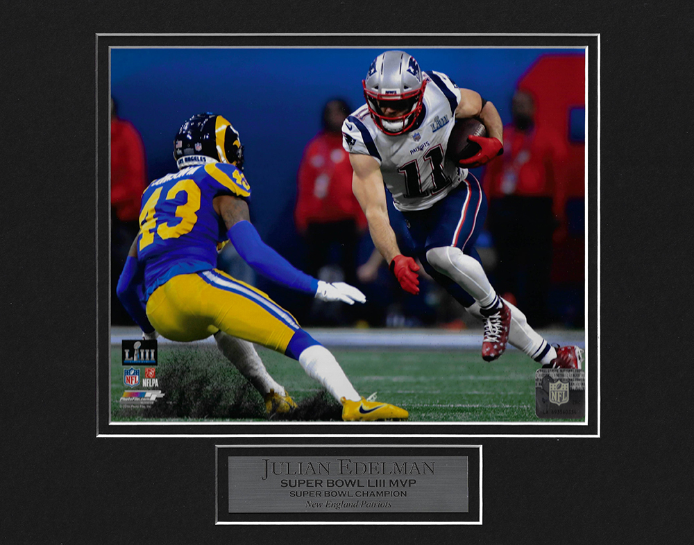 Julian Edelman photo run SBLIII matted to 11×14. This item is not framed unless you select the option for the cherry or black frame.