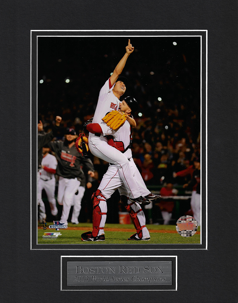 Koji Uehara David Ross photo celebration 2013 World Series Champions last out matted to 11×14. This item is not framed unless you select the option for the cherry or black frame.