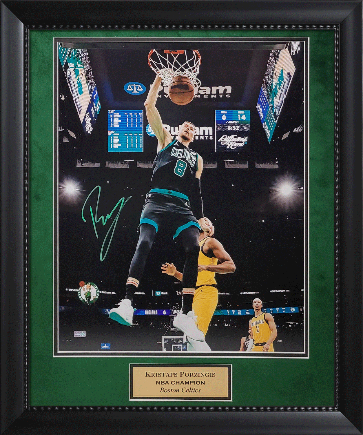 Kristaps Porzingis Autograph Photo Dunk, matted and framed to 23×27. Boston Celtics.