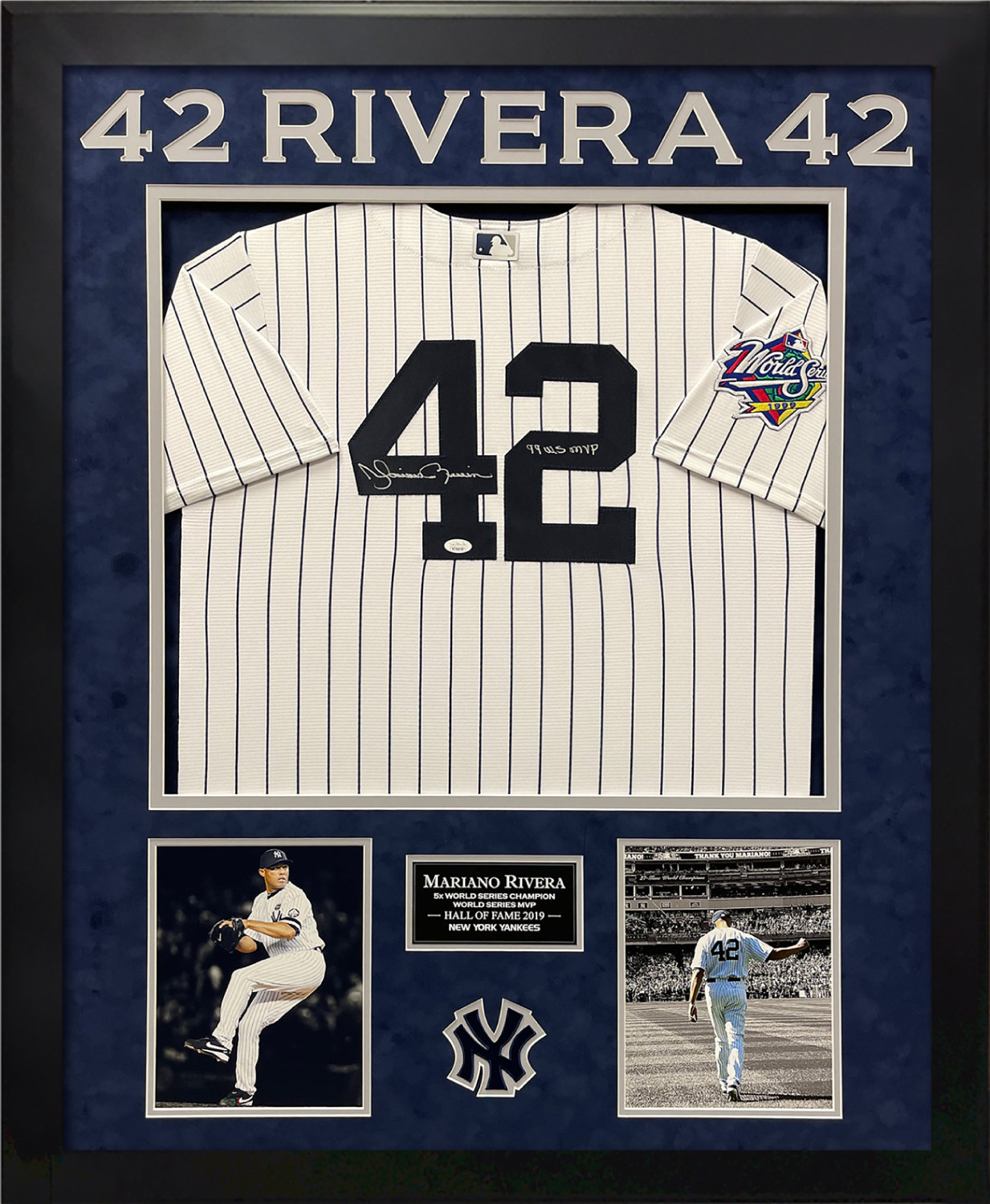 Mariano Rivera autograph jersey New York Yankees white with inscription “99 WS MVP” matted and framed to 32×40. Rivera is a 5x World Series Champion, a World Series MVP, and was inducted into the Baseball Hall of Fame in 2019.