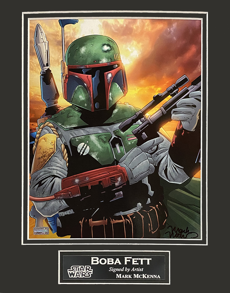 Mark McKenna autograph artist print Boba Fett clouds background matted to 11×14, Star Wars. This item is not framed unless you select the option for the cherry or black frame.