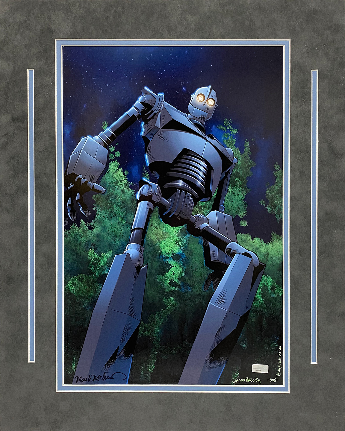 Mark McKenna autograph artist print Iron Giant matted to 16×20. This item is not framed unless you select the option for the cherry or black frame.