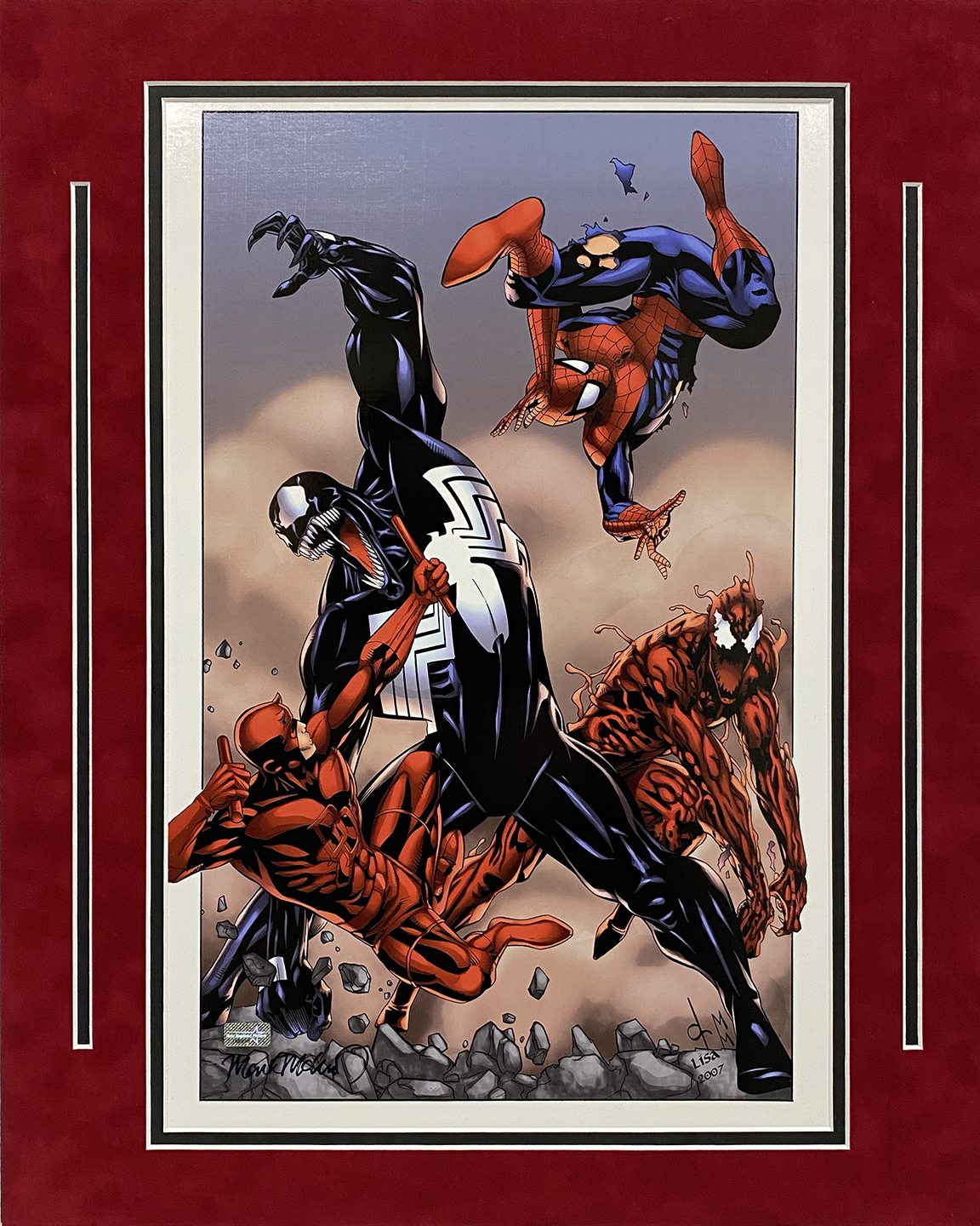 Mark McKenna autograph artist print Spiderman Daredevil Carnage Venom matted to 16×20. This item is not framed unless you select the option for the cherry or black frame.