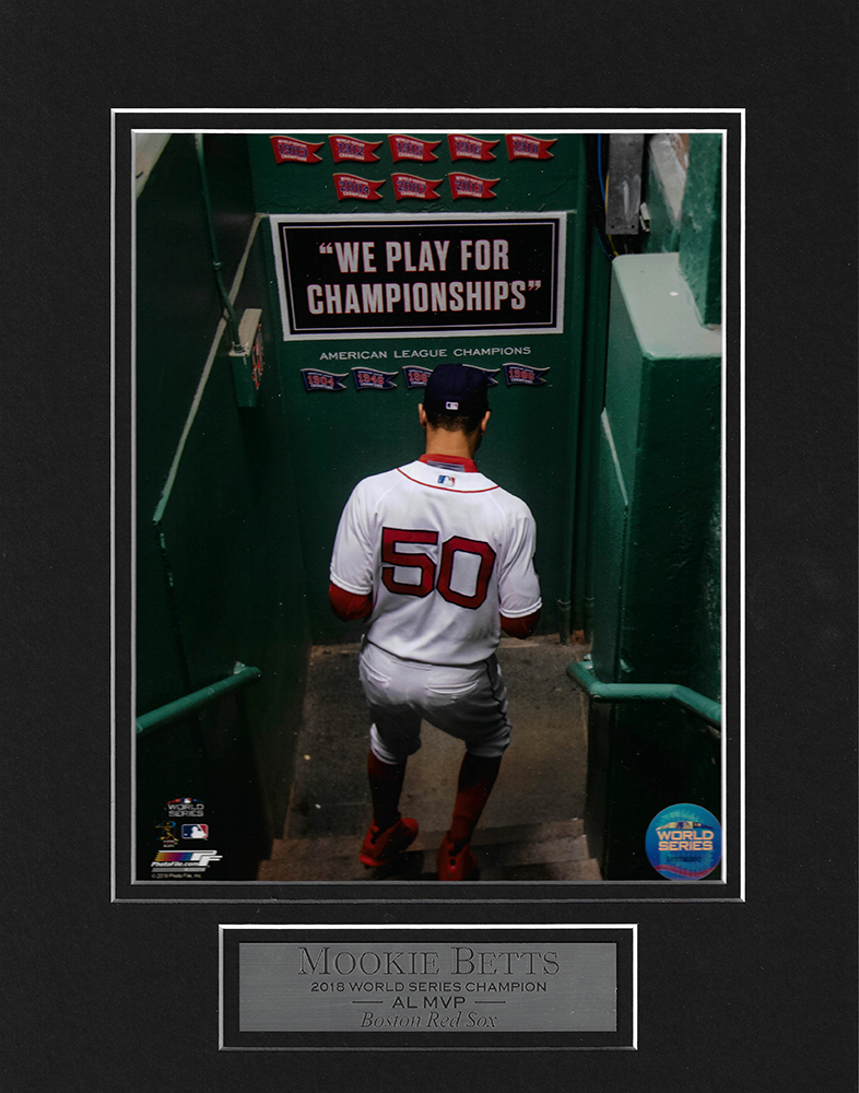 Mookie Betts photo dugout walk matted to 11×14, Boston Red Sox World Series Champion. This item is not framed unless you select the option for the cherry or black frame.