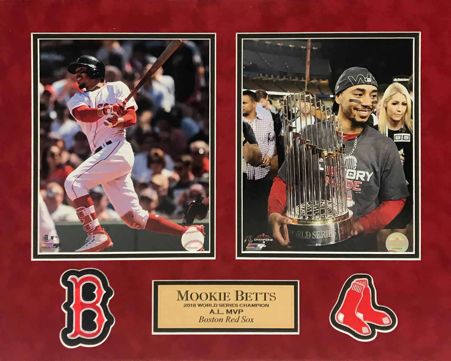 Mookie Betts photo swing trophy 2 way World Series 2018 champion matted to 16×20. This item is not frame unless you select the option for the cherry or black frame.
