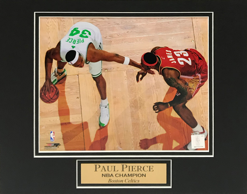 Paul Pierce photo dribble matted to 11×14 box out LeBron James. This item is not framed unless you select the option for the cherry or black frame.