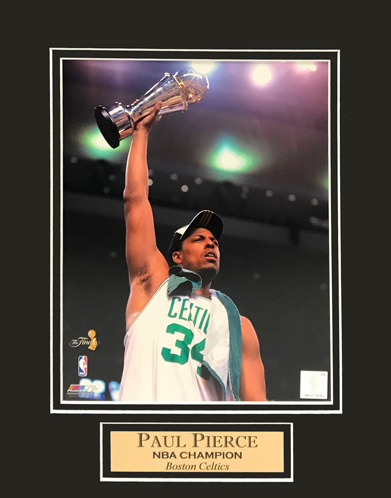 Paul Pierce photo hold trophy matted to 11×14, NBA Champion. This item is not framed unless you select the option for the cherry or black frame.