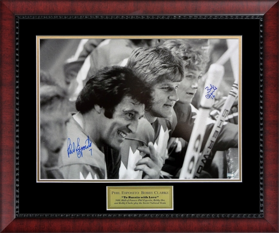 Phil Esposito Bobby Clarke Double Autograph Photo 23×27. Phil Esposito says high to Russia with love with the middle finger salute. Boston Bruins.