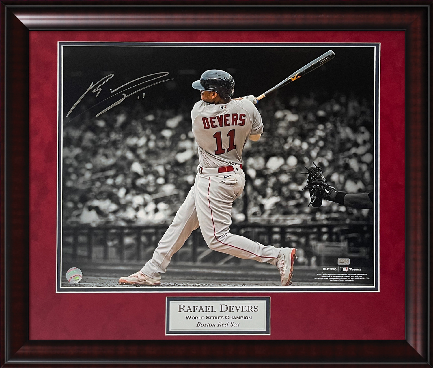 Rafael Devers Autograph Photo Swing Spotlight, matted and framed to 23×27. Boston Red Sox.