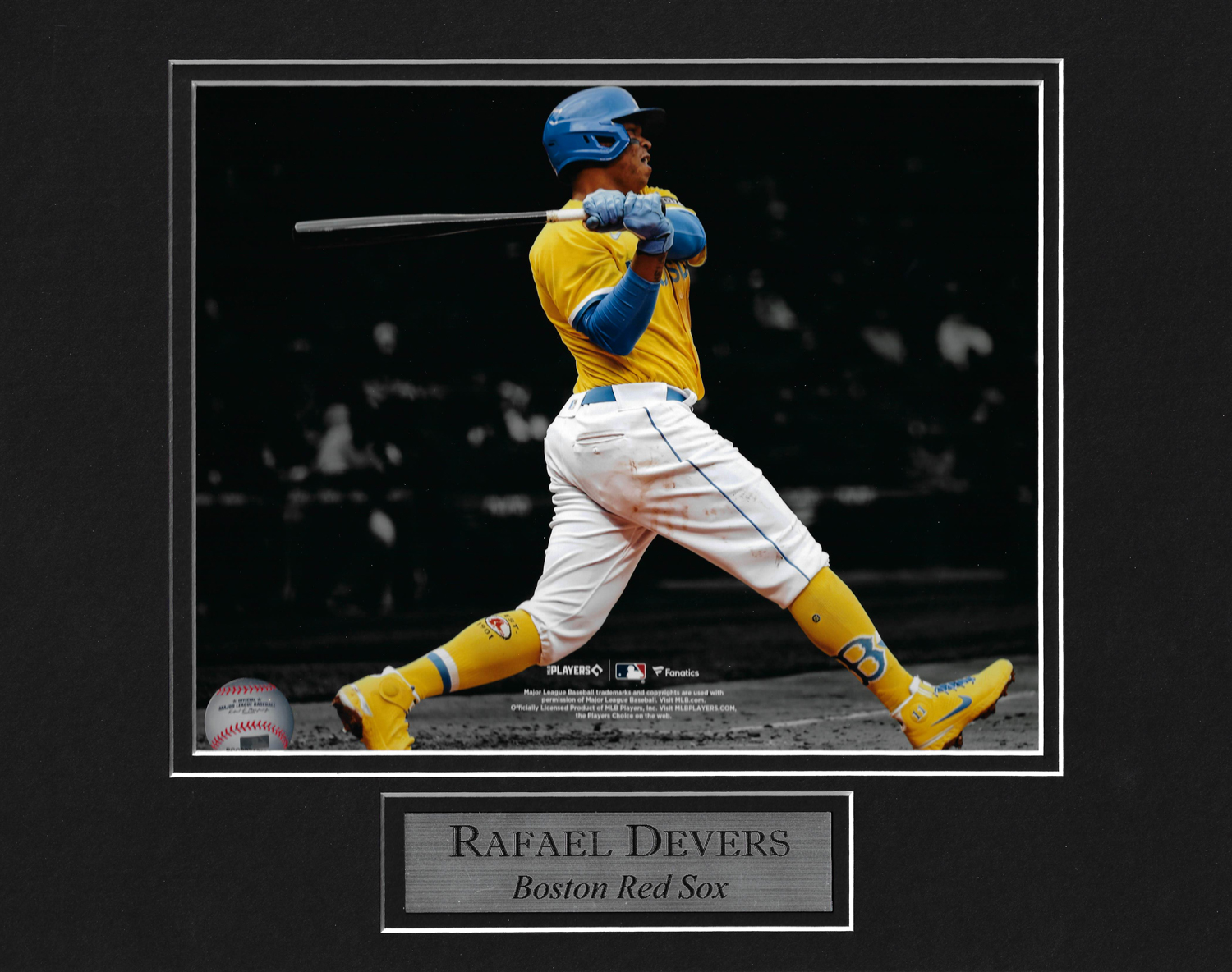 Rafael Devers photo yellow City Connect uniform swing spotlight matted to 11×14, Boston Red Sox.