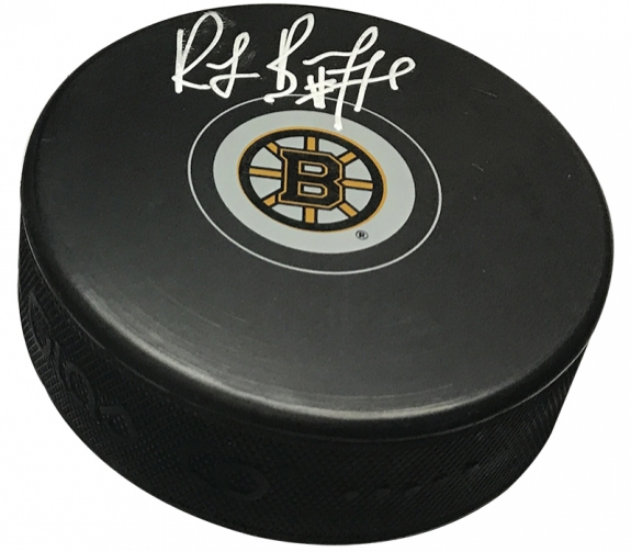 Boston Bruins spoke B puck autographed by Ray Bourque.