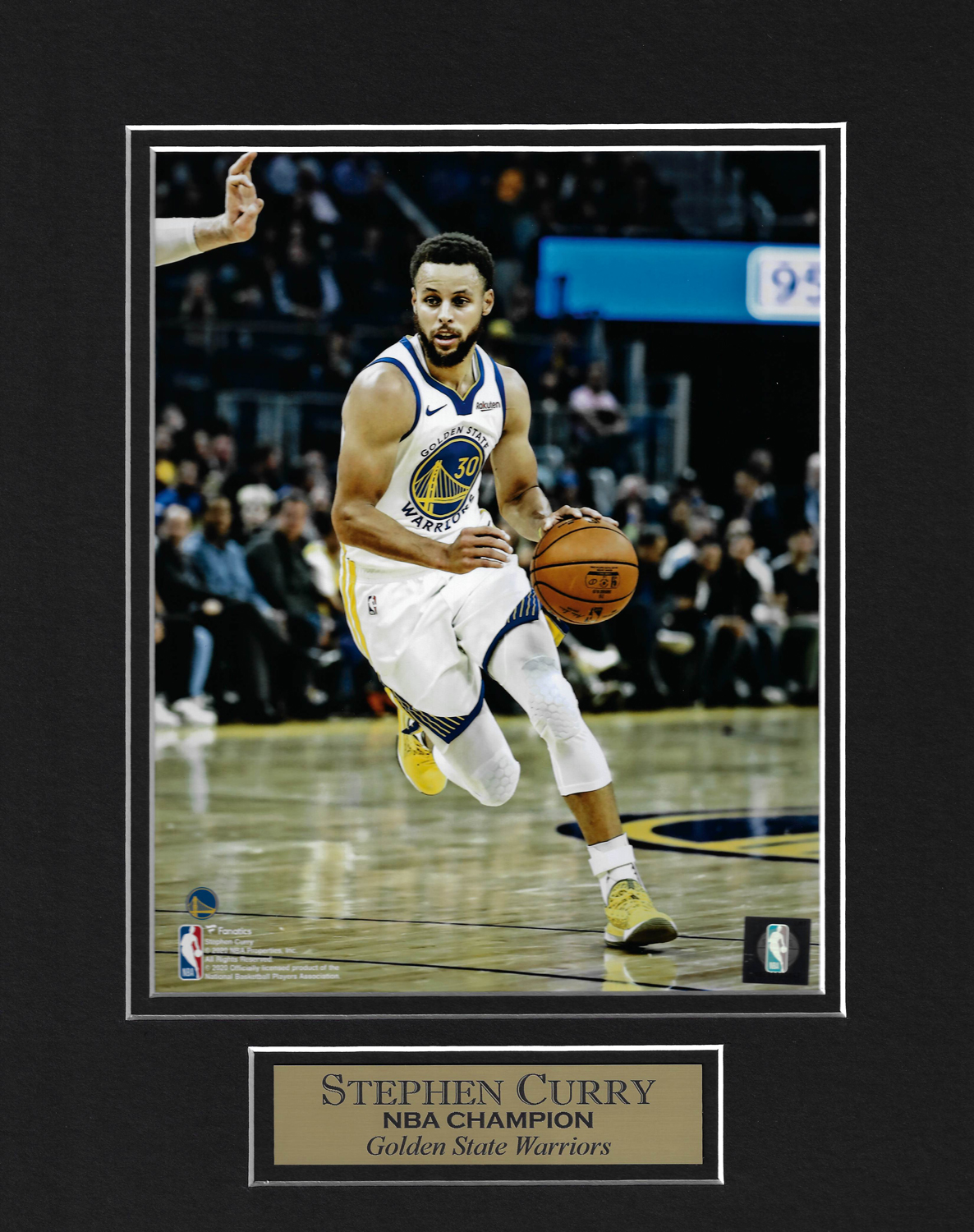 Stephen Curry photo dribble matted to 11×14, Golden State Warriors.