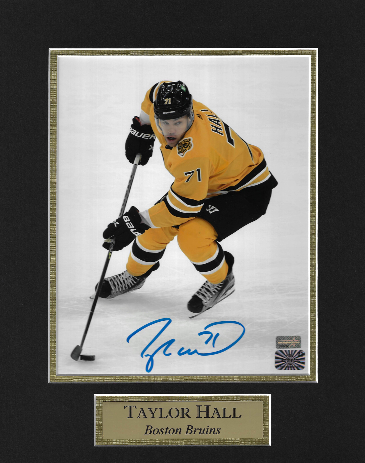 Taylor Hall autograph photo skate gold uniform matted to 11×14, Boston Bruins.