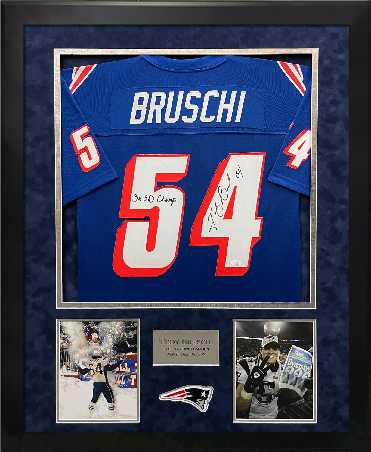 Tedy Bruschi autograph jersey royal legacy with inscription “3x SB Champ” matted and framed to 32×40. New England Patriots.