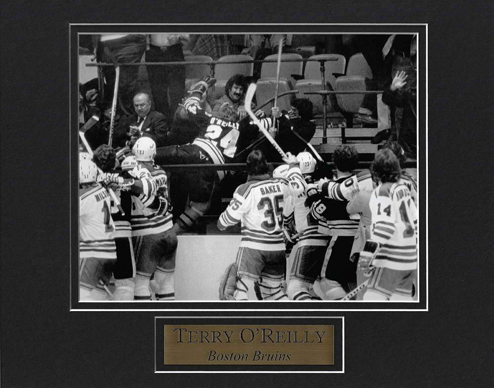 Terry O’Reilly photo fight in stands matted to 11×14. This item is not framed unless you select the option for the cherry or black frame.