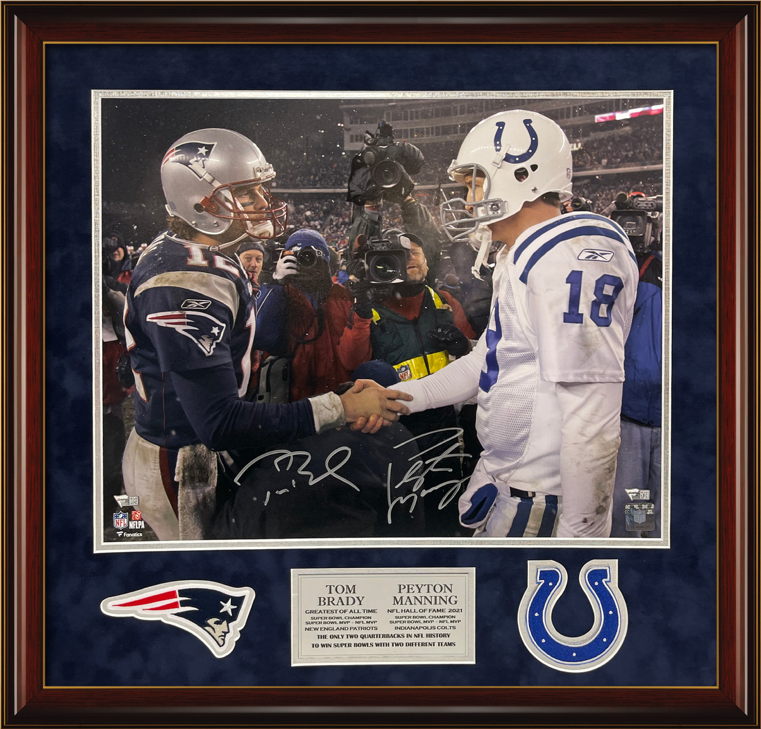 Tom Brady, Peyton Manning Double Autograph Photo, matted and framed to 26×27. New England Patriots, Indianapolis Colts.