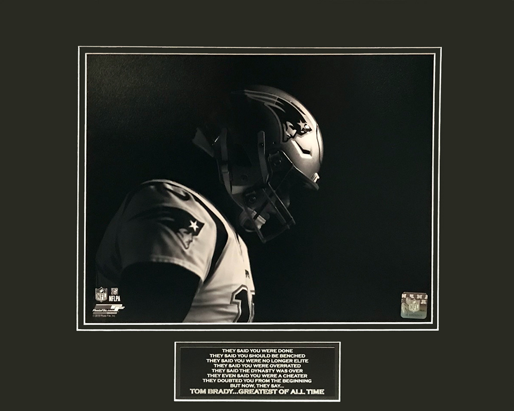 Tom Brady Photo Blacked Out Looking down with Helmet matted to 16×20. This item is not framed unless you select the option for the cherry or black frame. Thank You