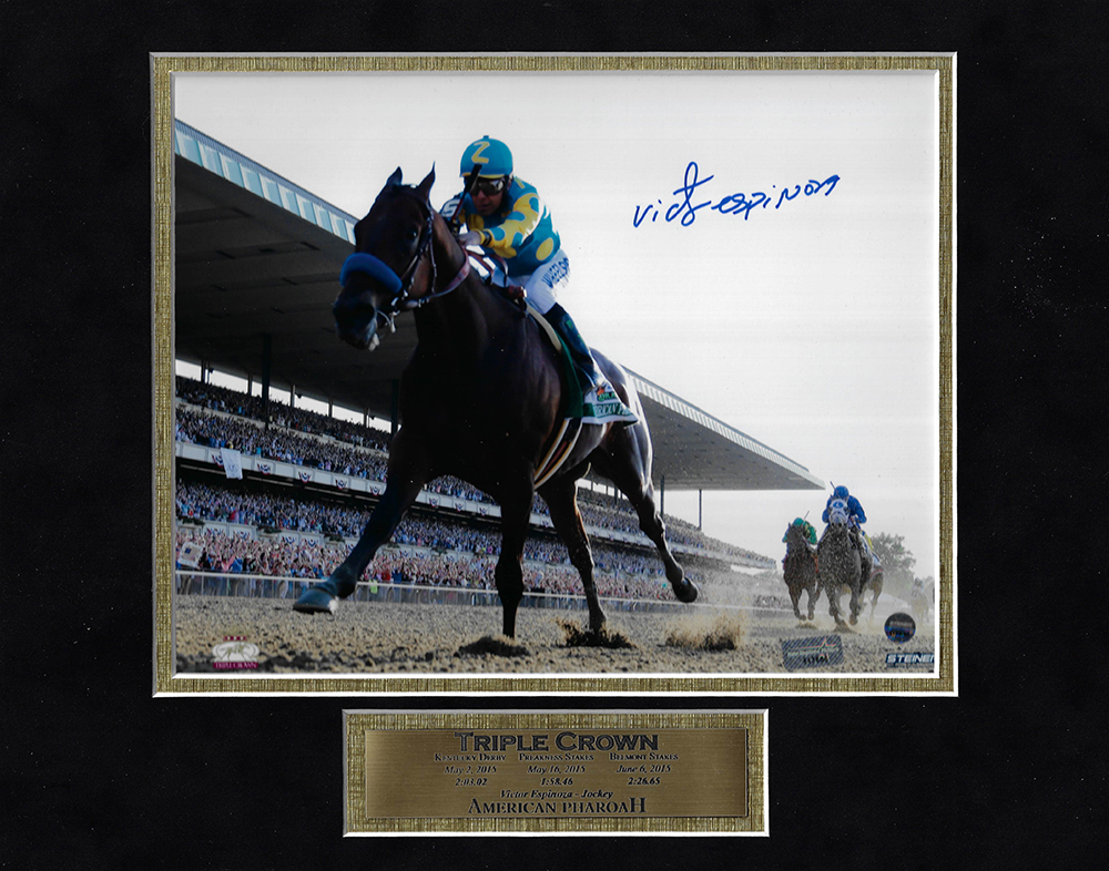 Victor Espinoza autograph photo horse American Pharoah 2015 Triple Crown Winner matted to 11×14. This item is not framed unless you select the option for the cherry or black frame. Victor Espinoza, riding American Pharoah, won the Kentucky Derby, Preakness Stakes, and the Belmont Stakes winning the Triple Crown in 2015. The photo was taken at the Belmont Stakes.