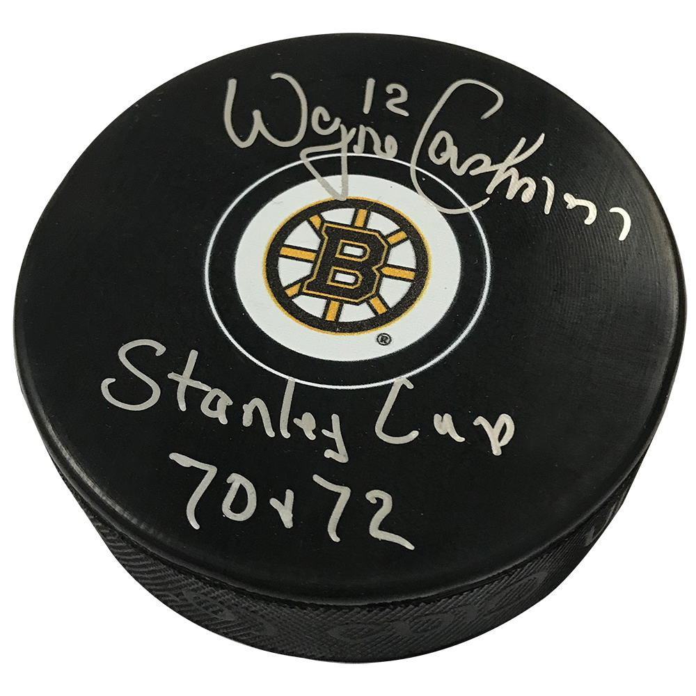 Wayne Cashman autograph puck with inscription, Boston Bruins.