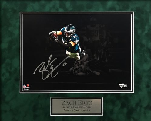 Zach Ertz autograph photo matted to 16×20 from Super Bowl 52, Philadelphia Eagles. This item is not framed unless you select the option for the cherry or black frame.