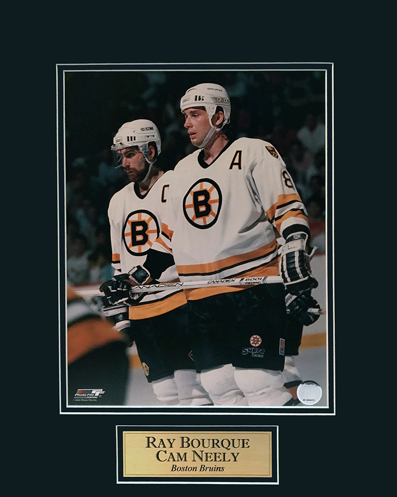 Ray Bourque Cam Neely Photo Playoffs matted to 16×20. This item is not framed unless you select the option for the cherry or black frame.